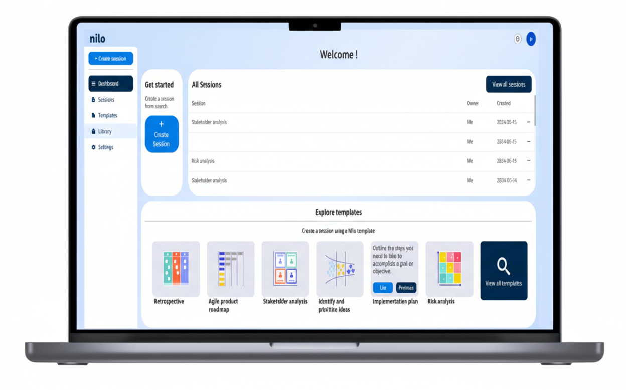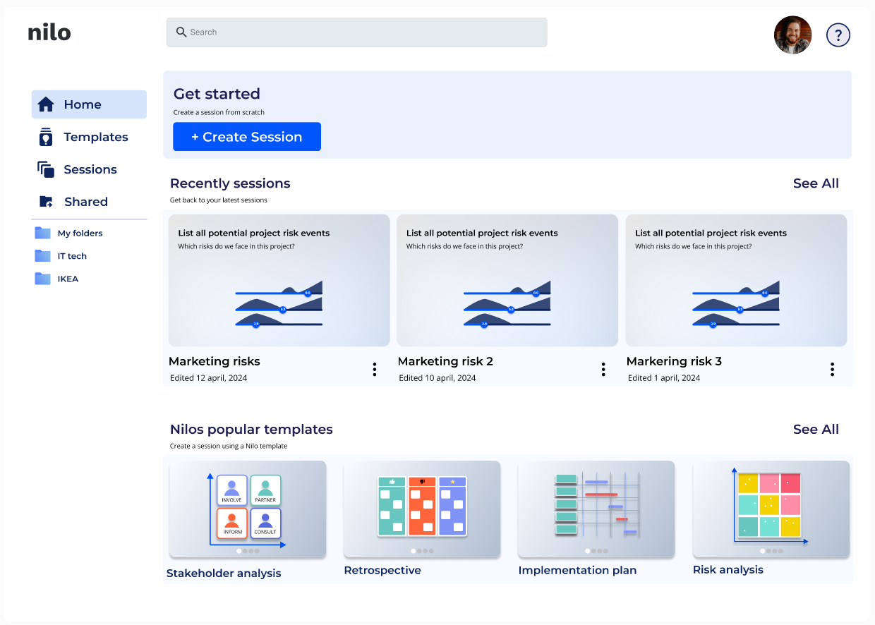 During my first internship (LIA1), I worked with Nilo Collaborations, a Swedish startup providing a digital tool for project leaders to collect and organize ideas through structured sessions. My role was to redesign the desktop dashboard and develop a mobile version to make the product more modern, intuitive, and user-friendly.